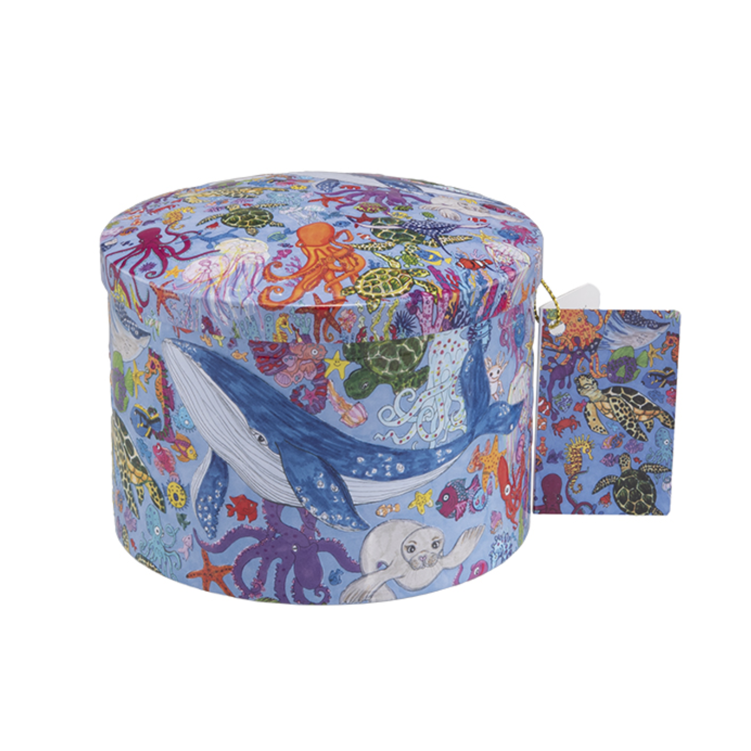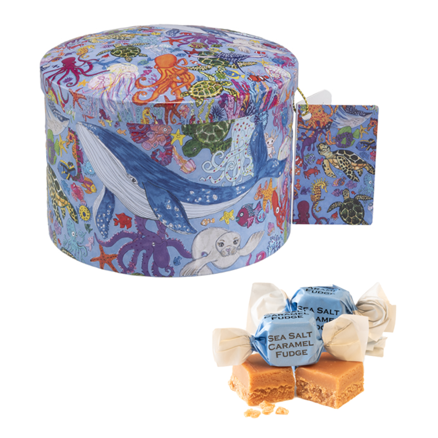 [BARATTOLO] – Le caramelle inglesi fudge aromatizzate alla vaniglia panna e caramello salato, sono conservate in una lattina, con tappo, dalla forma rotonda e decorata con stampe di disegni a tema animali dell’acquario a rilievo.