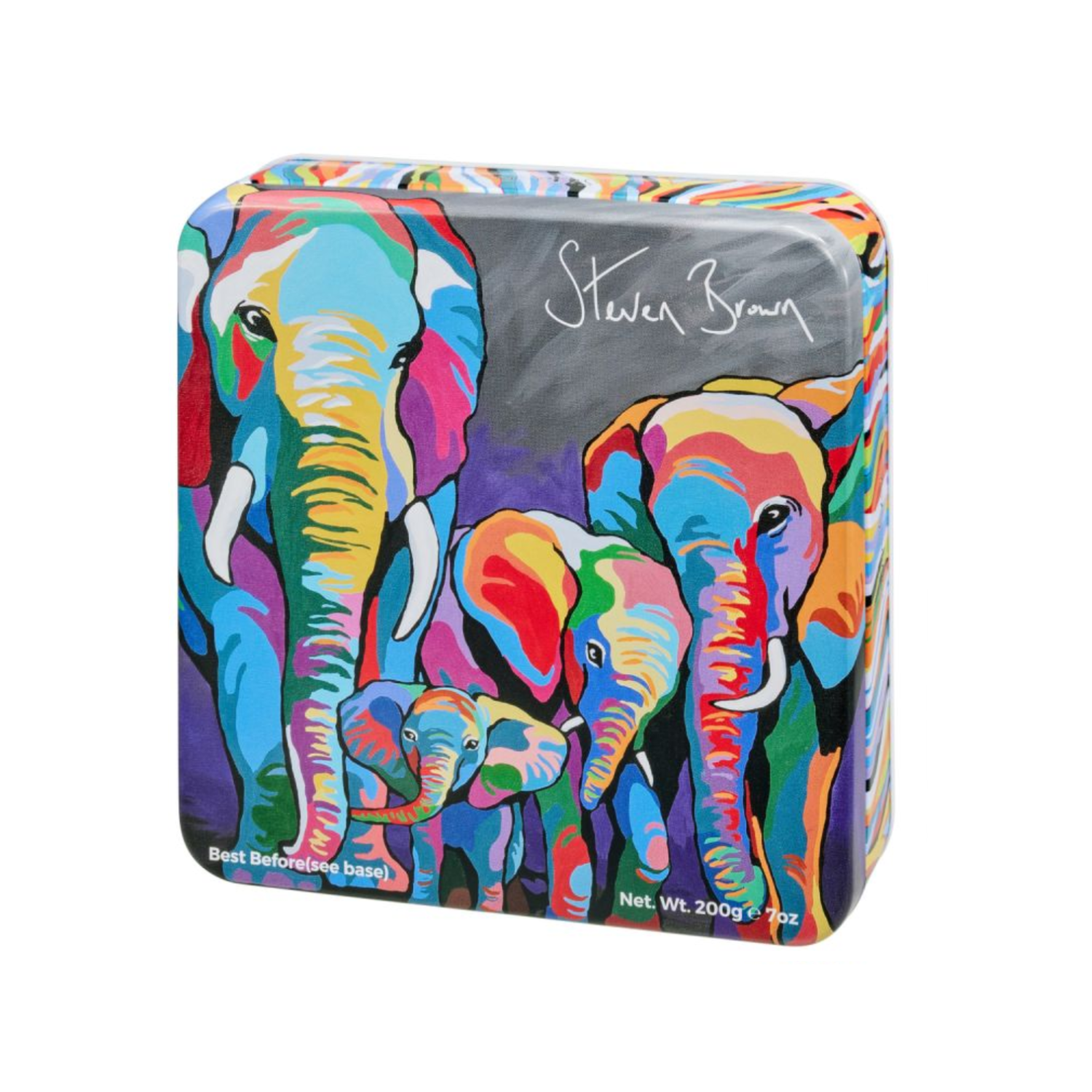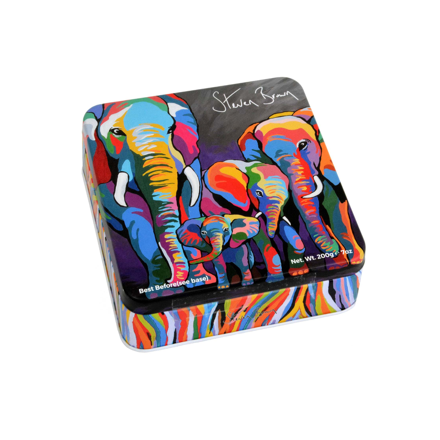 [BARATTOLO] – Le caramelle inglesi fudge aromatizzate alla vaniglia e panna, sono conservate in una lattina, con tappo, dalla forma quadrata e decorata con stampe di disegni a tema di animali della savana.