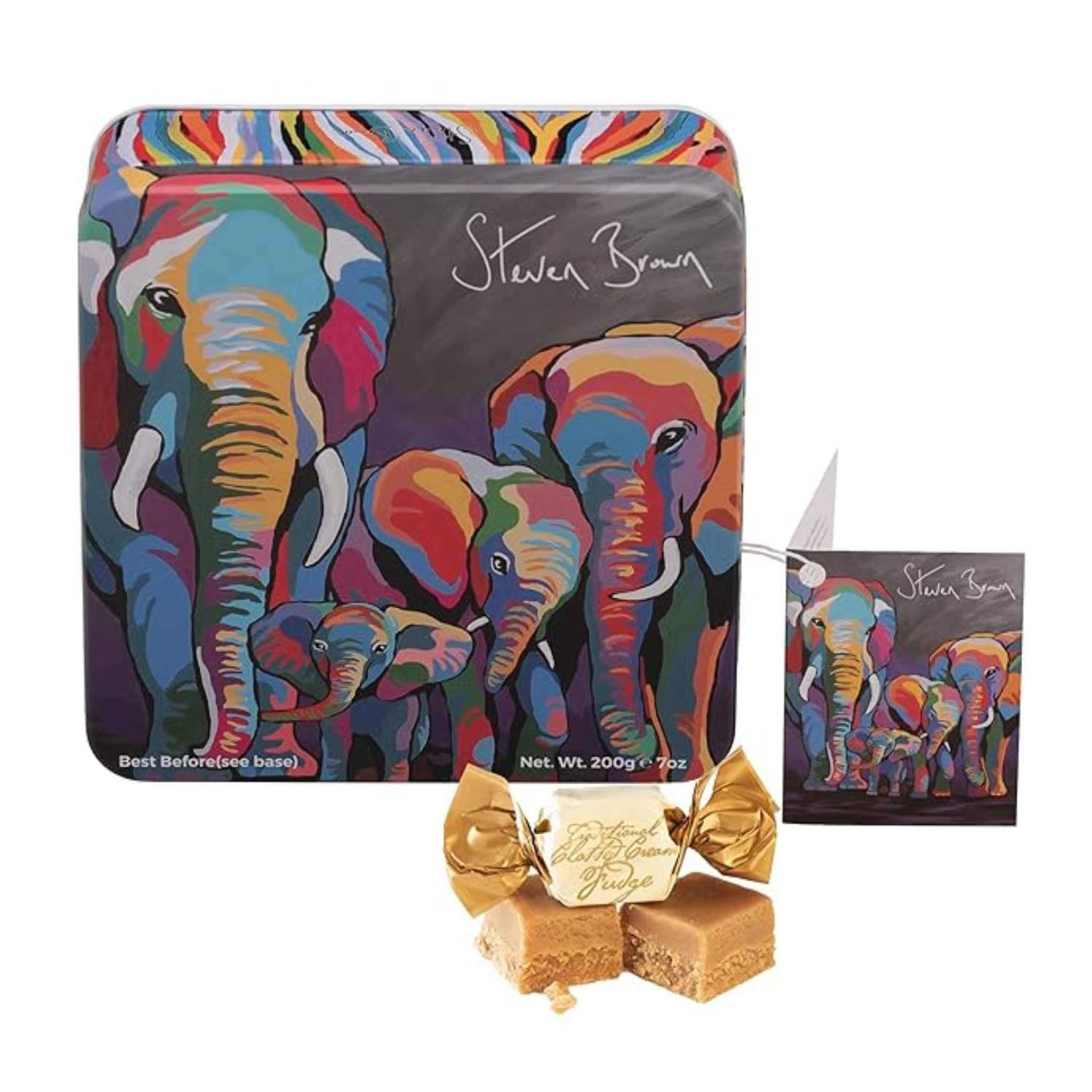 - “Clotted Cream Fudge”: deliziose caramelle fudge al gusto panna, conservate in lattina di metallo con coperchio apribile e disegni di stampe animali della savana (1 x 200 grammi). Prodotto in Inghilterra.