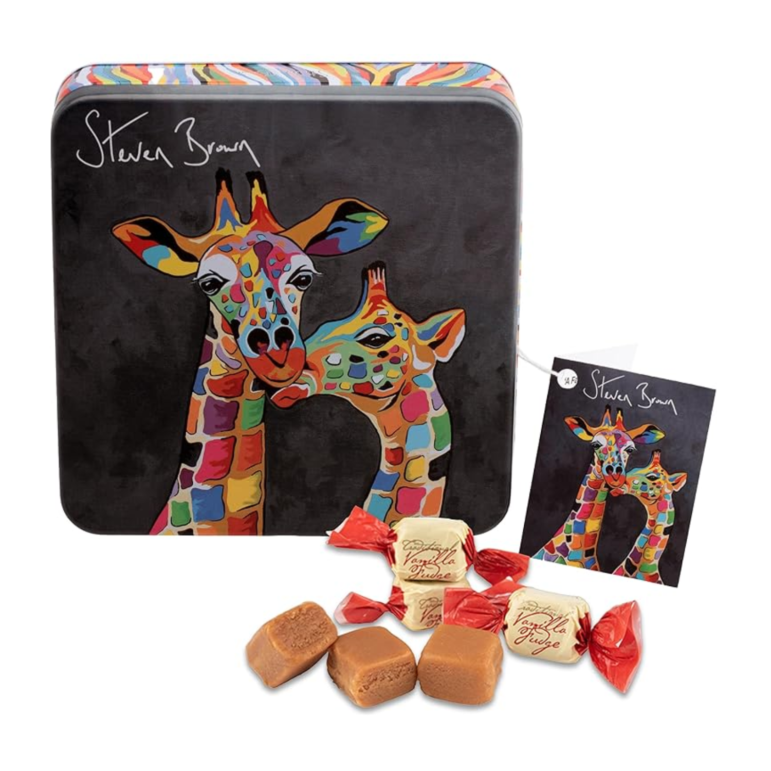 - “Vanilla Fudge”: deliziose caramelle fudge al gusto panna e vaniglia, conservate in lattina di metallo con coperchio apribile e disegni di stampe animali della savana (1 x 200 grammi). Prodotto in Inghilterra.