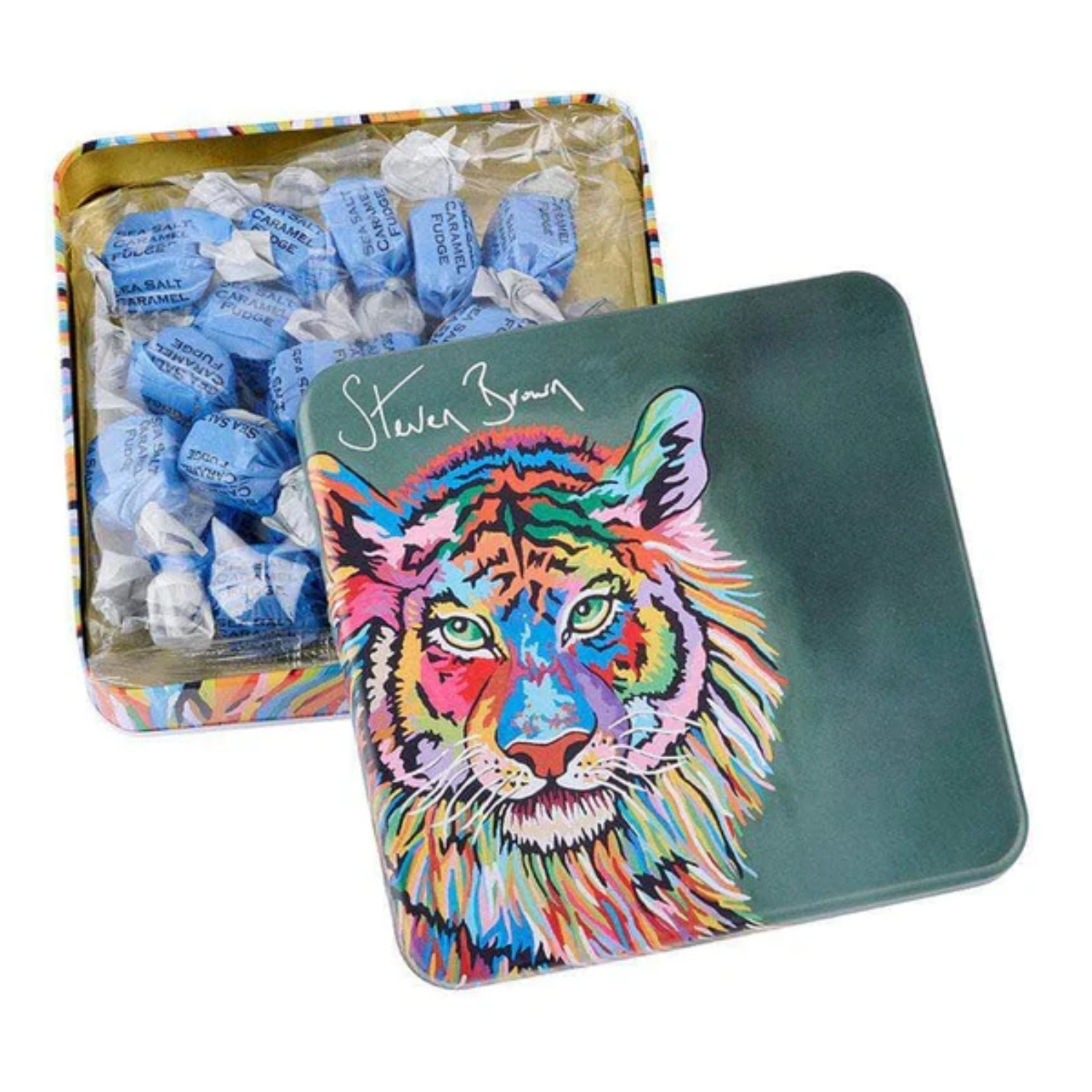 [BARATTOLO] – Le caramelle inglesi fudge aromatizzate alla vaniglia panna e caramello salato, sono conservate in una lattina, con tappo, dalla forma quadrata e decorata con stampe di disegni a tema di animali della savana.