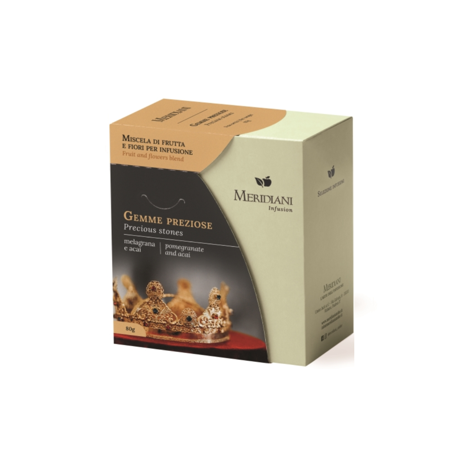 - “Gemme Preziose”: astuccio con all’interno una confezione in busta di miscela di frutta e fiori per infusione con melagrana, mela, ibisco, barbabietola, fiori di malva, pepe rosa e mirtilli (80 grammi). Prodotto in Italia.