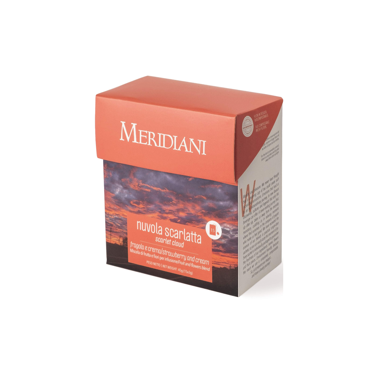 - “Nuvola Scarlatta”: astuccio con all’interno 15 infusori monodose biodegradabili, confezionati ognuno singolarmente, di miscela di frutta e fiori per infusione, con mela, ibisco, aroma di crema e pezzi di fragola (15 filtri – 45 grammi). Confezionato in Italia.