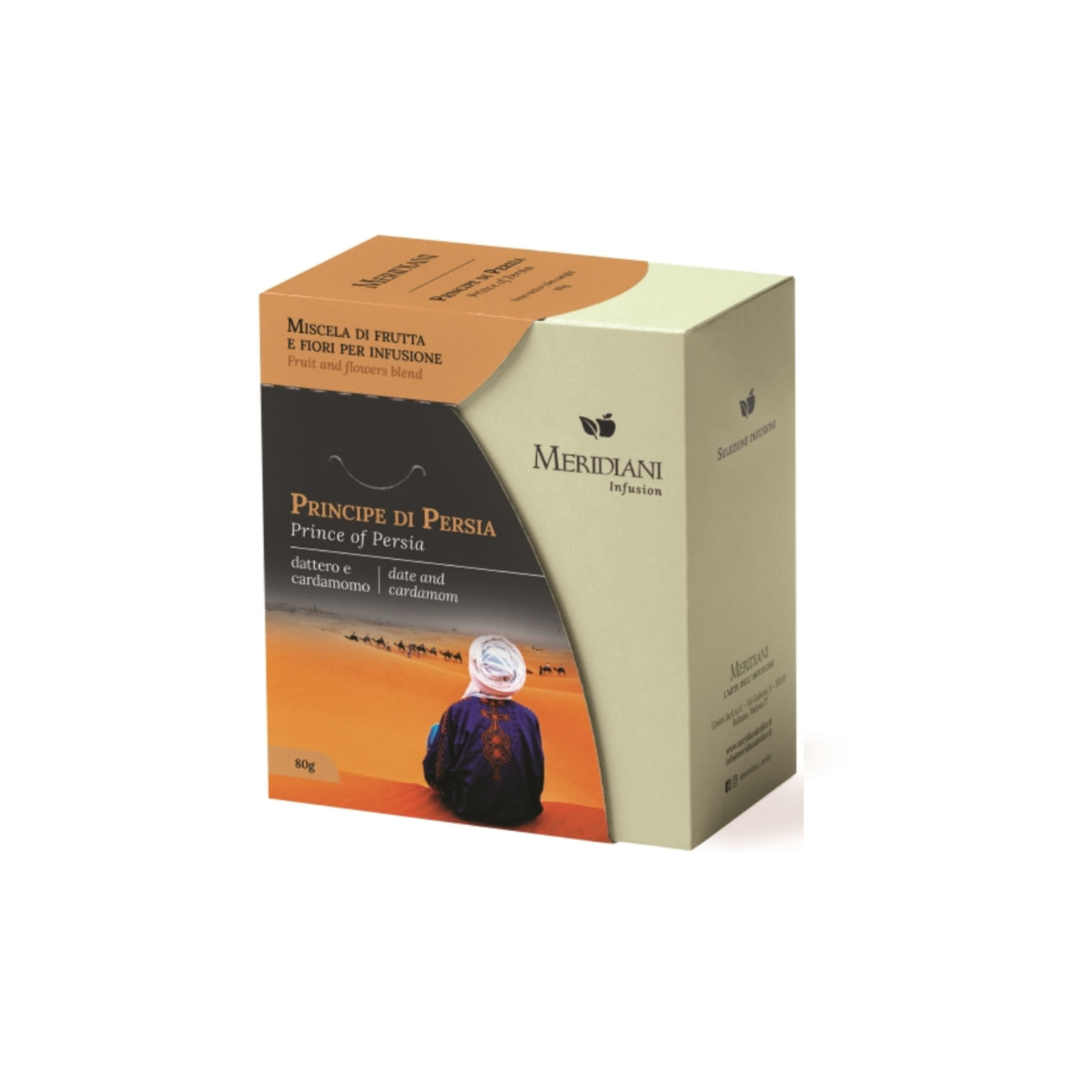 - “Principe di Persia”: astuccio con all’interno una confezione in busta di miscela di frutta e fiori per infusione con dattero, uvetta, cocco, fico e spezie (80 grammi). Prodotto in Italia.