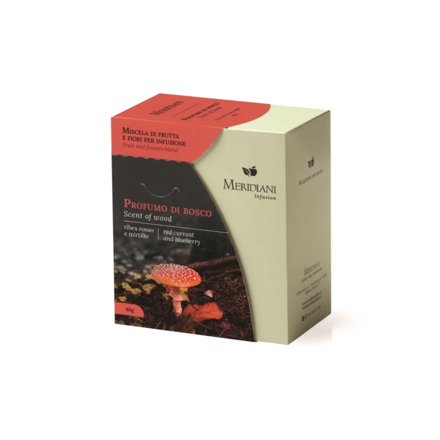- “Profumo di Bosco”: astuccio con all’interno una confezione in busta di miscela di frutta e fiori per infusione con ibisco, uvetta, sambuco, ribes rosso e mirtillo (80 grammi). Confezionato in Italia.