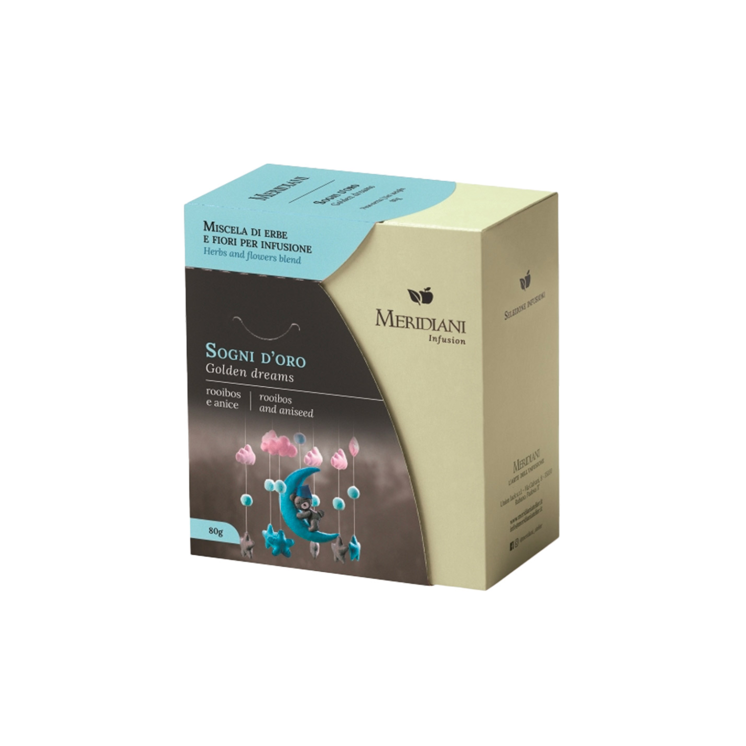 - “Sogni d’Oro”: astuccio con all’interno una confezione in busta di miscela di erbe e fiori per infusione a base di rooibos con anice, finocchio, melissa, cumino e petali di girasole (80 grammi). Prodotto in Italia.