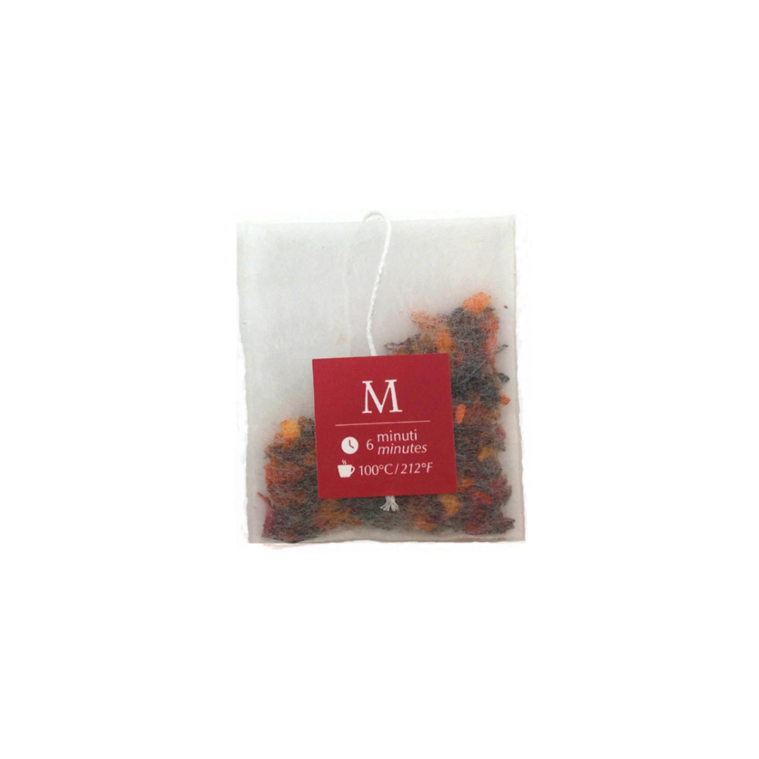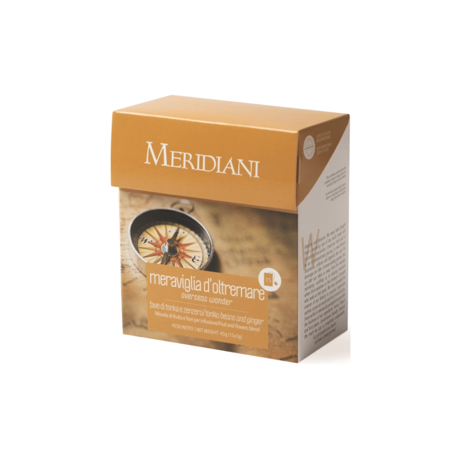 - “Meraviglia d’Oltremare”: astuccio con all’interno 15 infusori monodose biodegradabili, confezionati ognuno singolarmente, di miscela di frutta e fiori per infusione, con mela, zenzero, arancia, ibisco, citronella (15 filtri – 45 grammi). Confezionato in Italia.