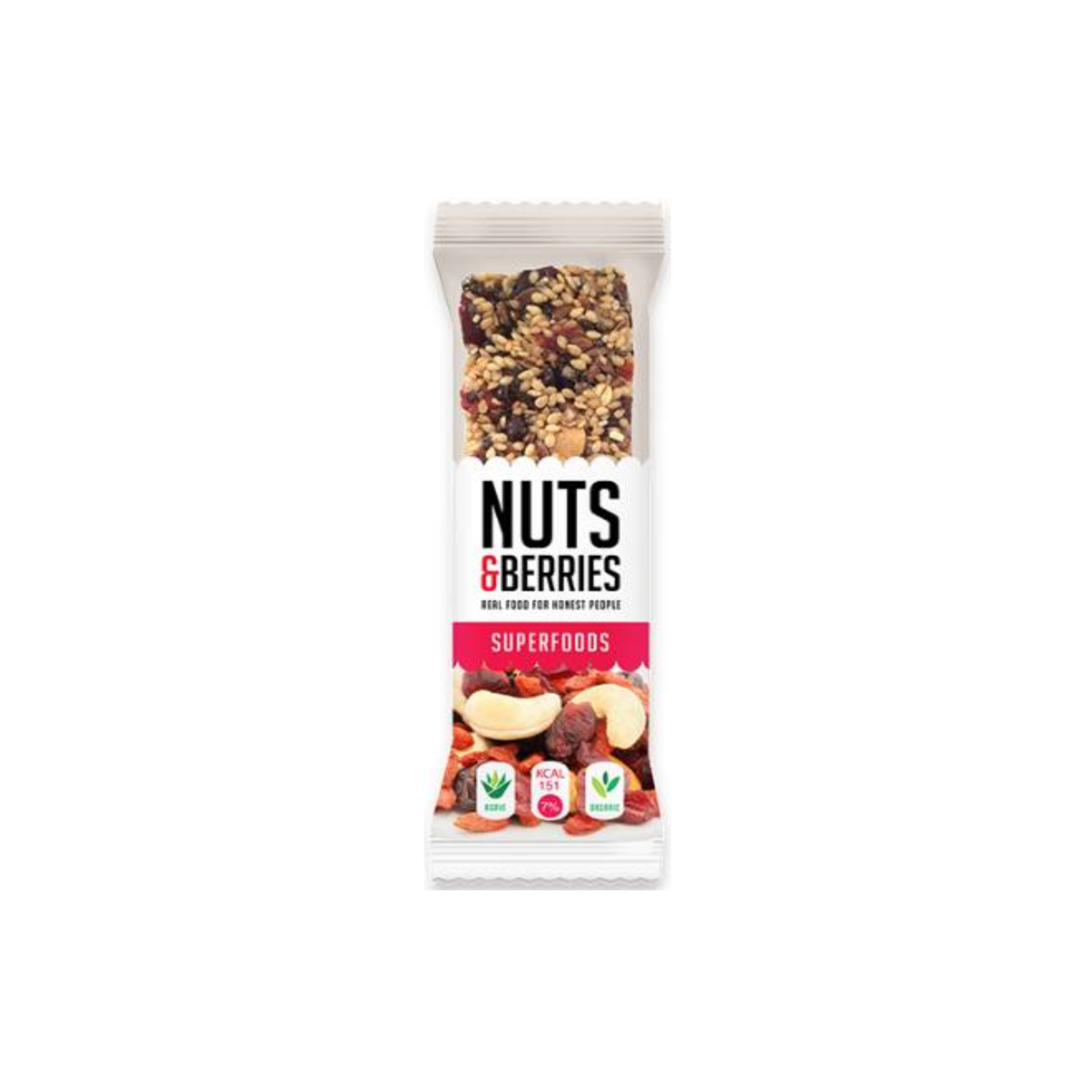 - “Superfoods”: quando la fame si fa sentire, tira fuori una barretta biologica alla frutta secca con semi di girasole, mirtilli, fave di cacao, semi di chia, fiocchi d’avena, anacardi, bacche di goji, semi di lino! Uno snack con ingredienti attentamente selezionati per affrontare la tua prossima avventura con uno spuntino pratico e gustoso (15 x 30 grammi). Prodotto in Olanda.