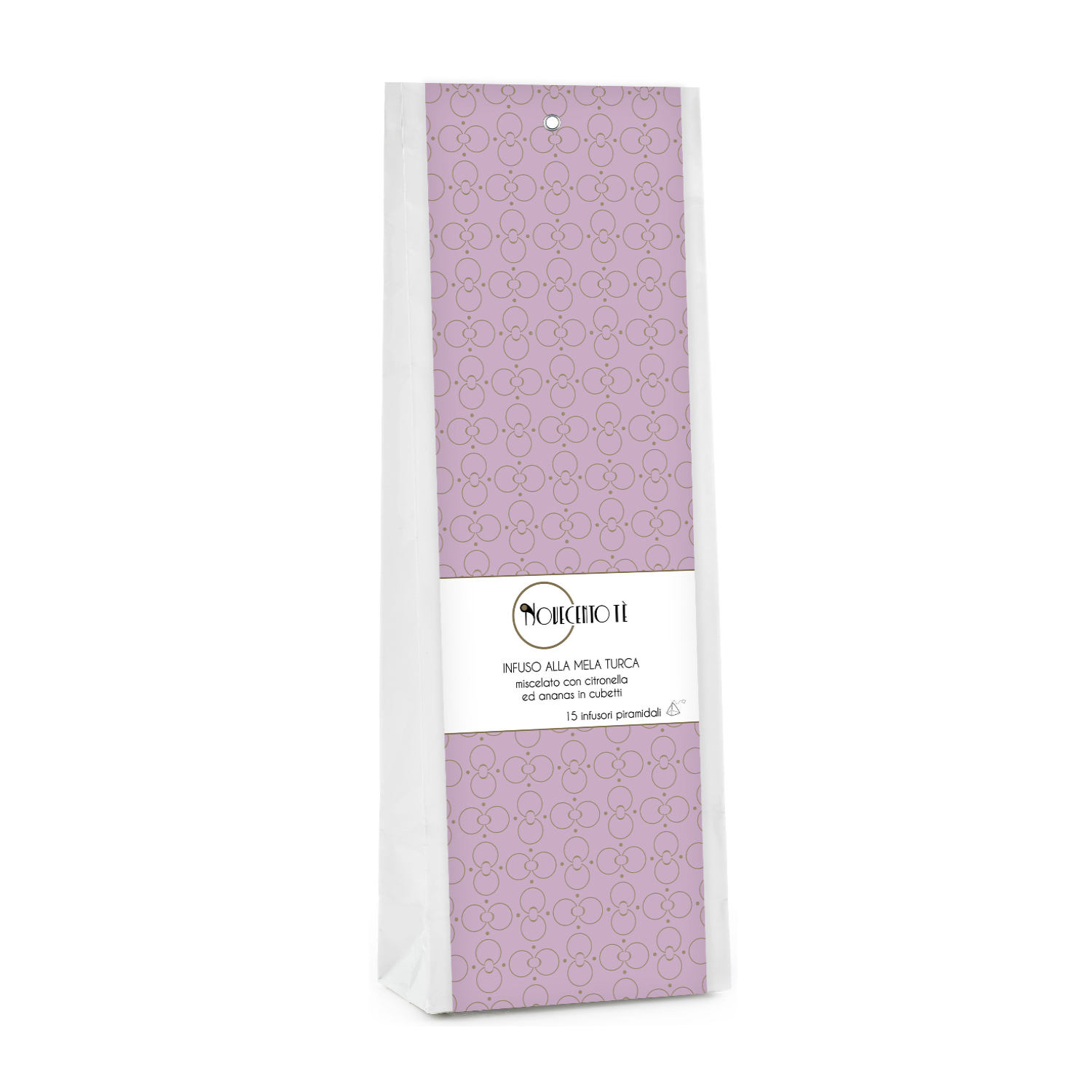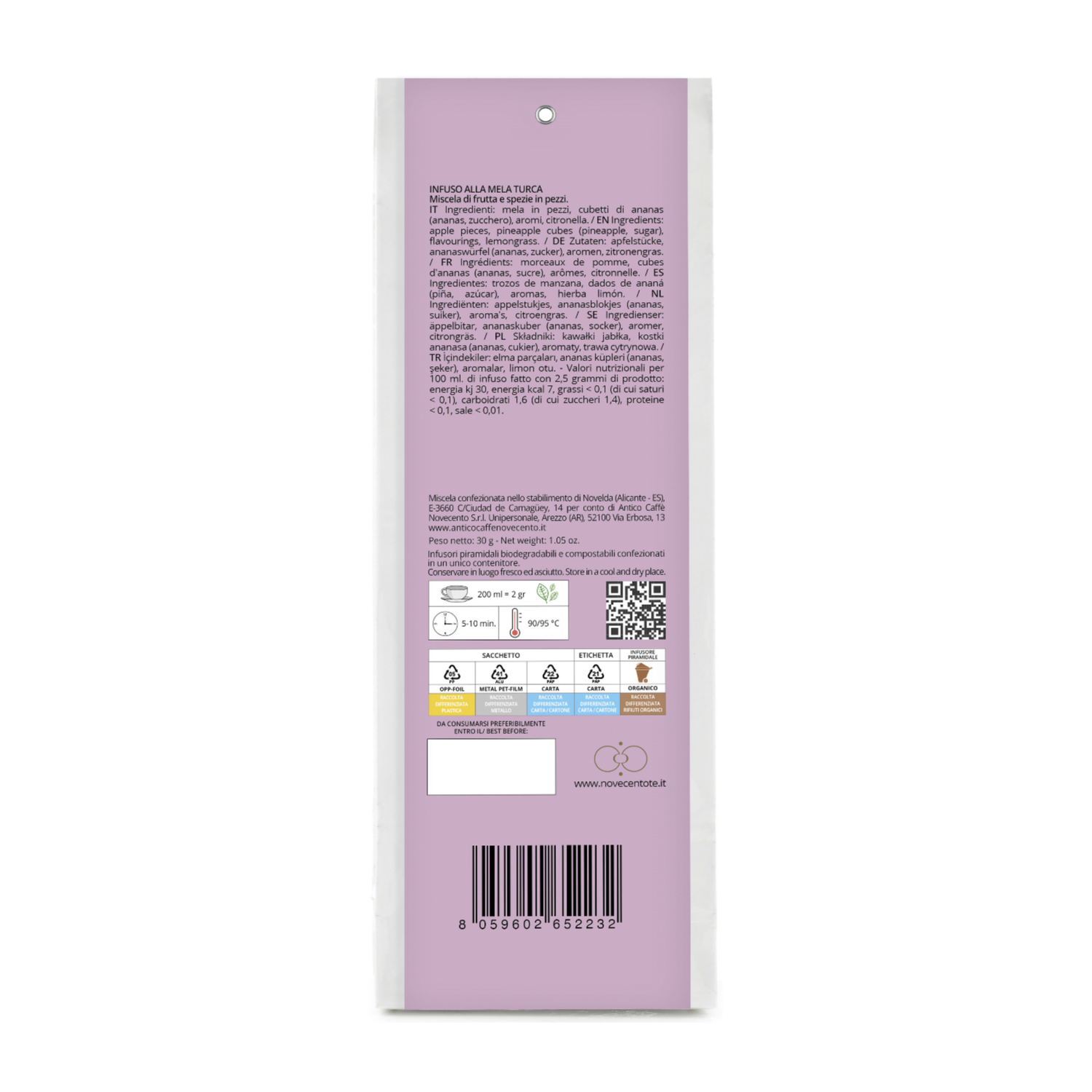 - “Infuso alla Mela Turca”: miscela di frutta e spezie in pezzi confezionata in infusori piramidali. Il sacchetto contiene al proprio interno 15 infusori piramidali. Prodotto miscelato e confezionato in Germania (30 grammi). Origine della miscela: Germania.