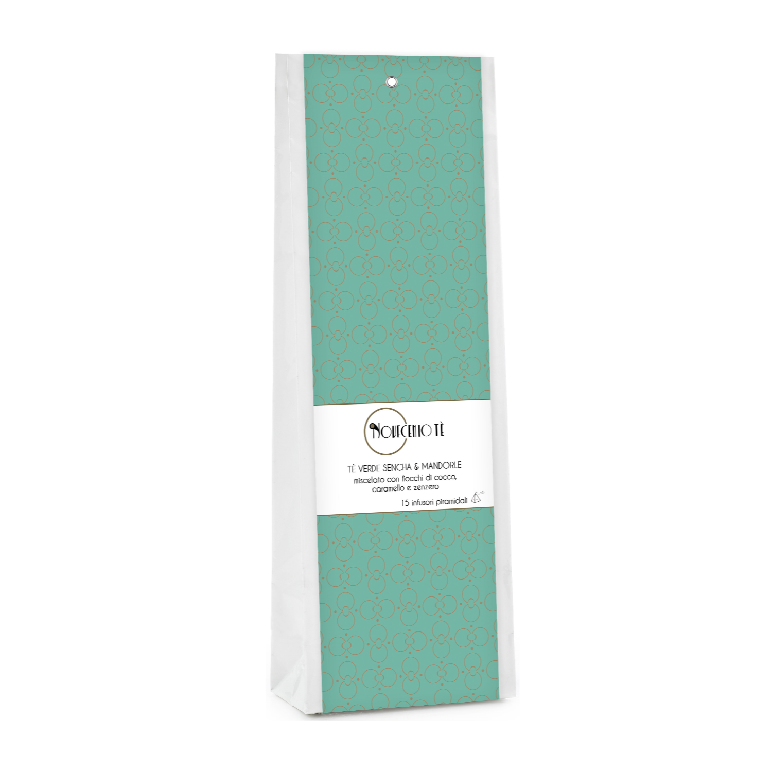 La collezione LOGO a marchio NOVECENTO TE’® presenta una particolare cura e ricercatezza nel packaging della confezione esterna, riservandosi comunque sempre quella riconoscibilità legata alla chiarezza ed alla essenzialità del decoro. All’interno del sacchetto sono conservati 15 infusori piramidali biodegradabili e compostabili. Il sacchetto viene sigillato ed è realizzato in foglio laminato a 3 strati di elevata qualità: foglio OPP, carta Kraft e rivestimento in PVDC, in modo che le miscele conservate all’interno possano mantenere il proprio aroma sempre inalterato. Il sacchetto può diventare anche una perfetta ricarica di prodotto per ogni occasione!