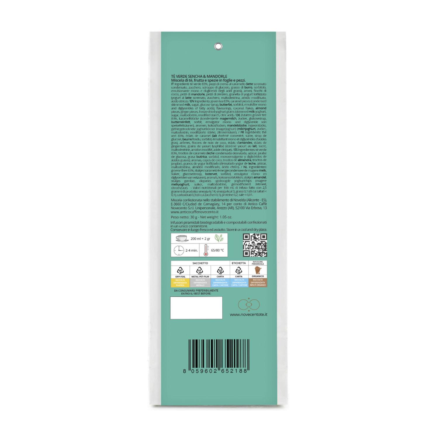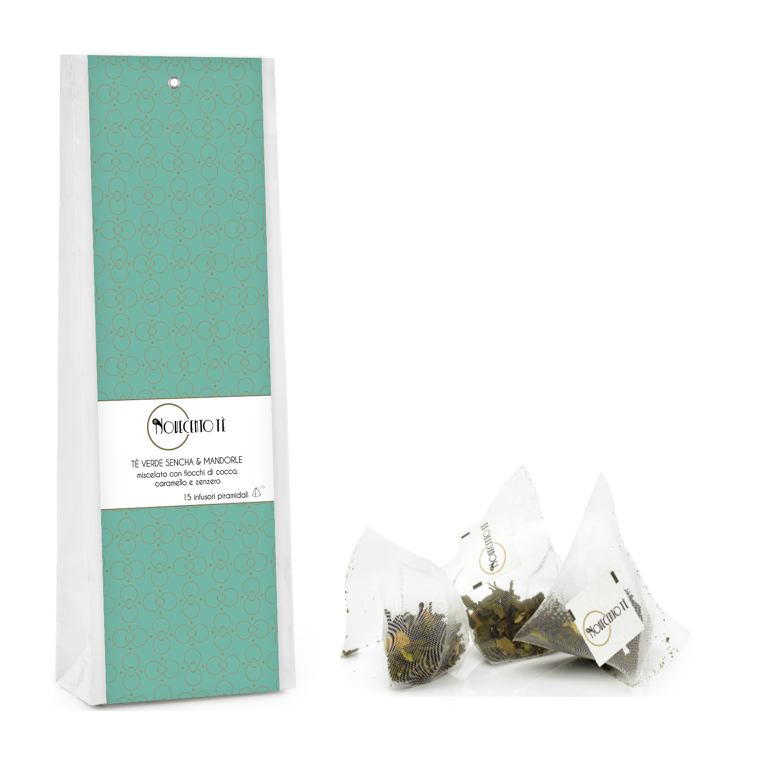 Novecento Tè® | Tè Verde Sencha e Mandorle – 15 Filtri Piramide | Verde Sencha Mandorle Caramello Zenzero | Miscela Tè Verde Mandorle Spezie