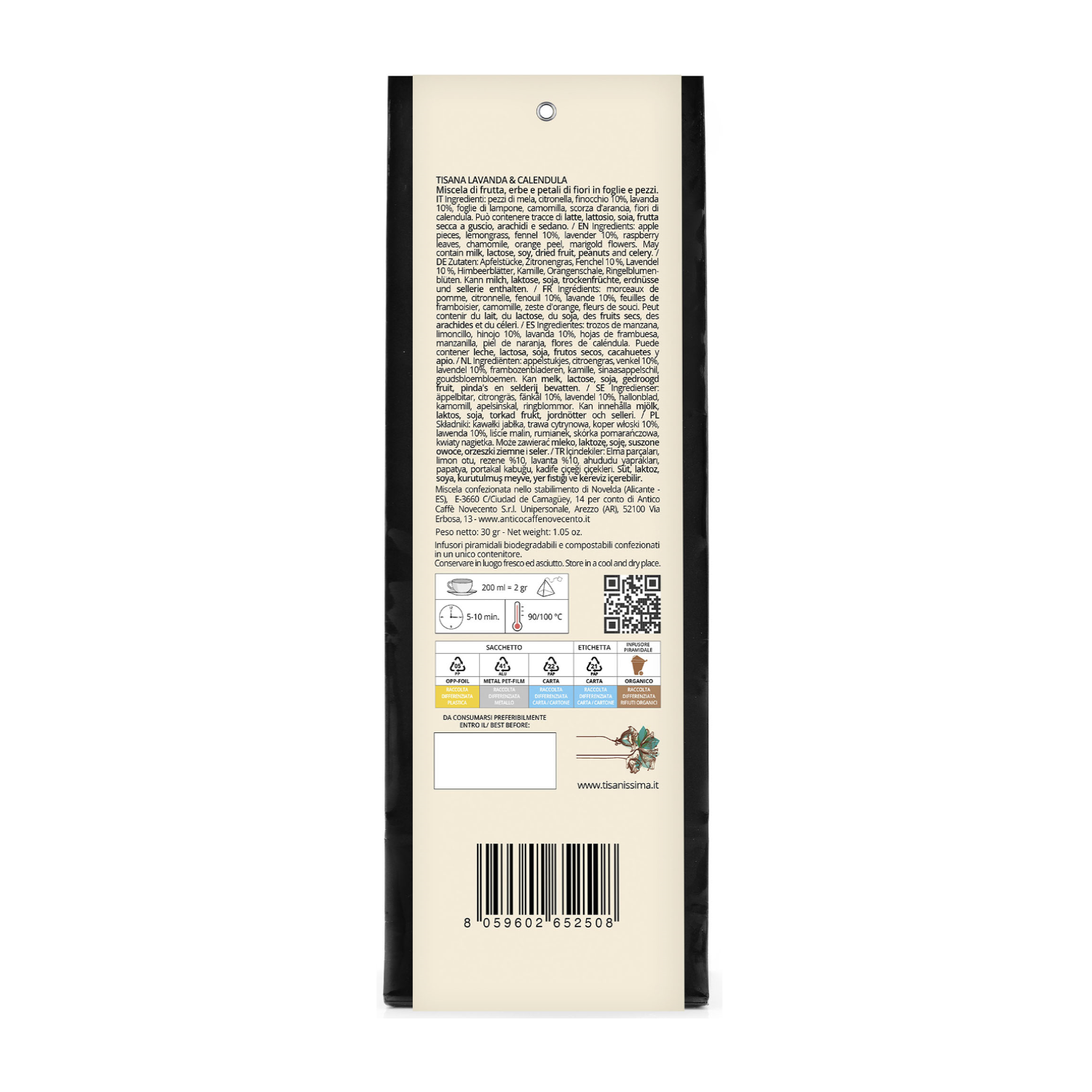 La tisana presenta diversi elementi naturali che aiutano il rilassamento. Per creare questo infuso, sono stati impiegati diversi ingredienti: mela, citronella, finocchio, lavanda, lamponi, camomilla e calendula. Gli elementi che compongono questo profumato mix vengono raccolti a mano ed essiccati a basse temperature, in maniera tale che si possano mantenere inalterate le proprietà e gli aromi speciali infusi. Una combinazione di fiori ed ingredienti genuini che aiutano a rilassarsi ed a conciliare il sonno. La tisana di erbe a base di lavanda e finocchio ha un effetto riequilibrante e tonificante e può essere consumata in qualsiasi momento della giornata.