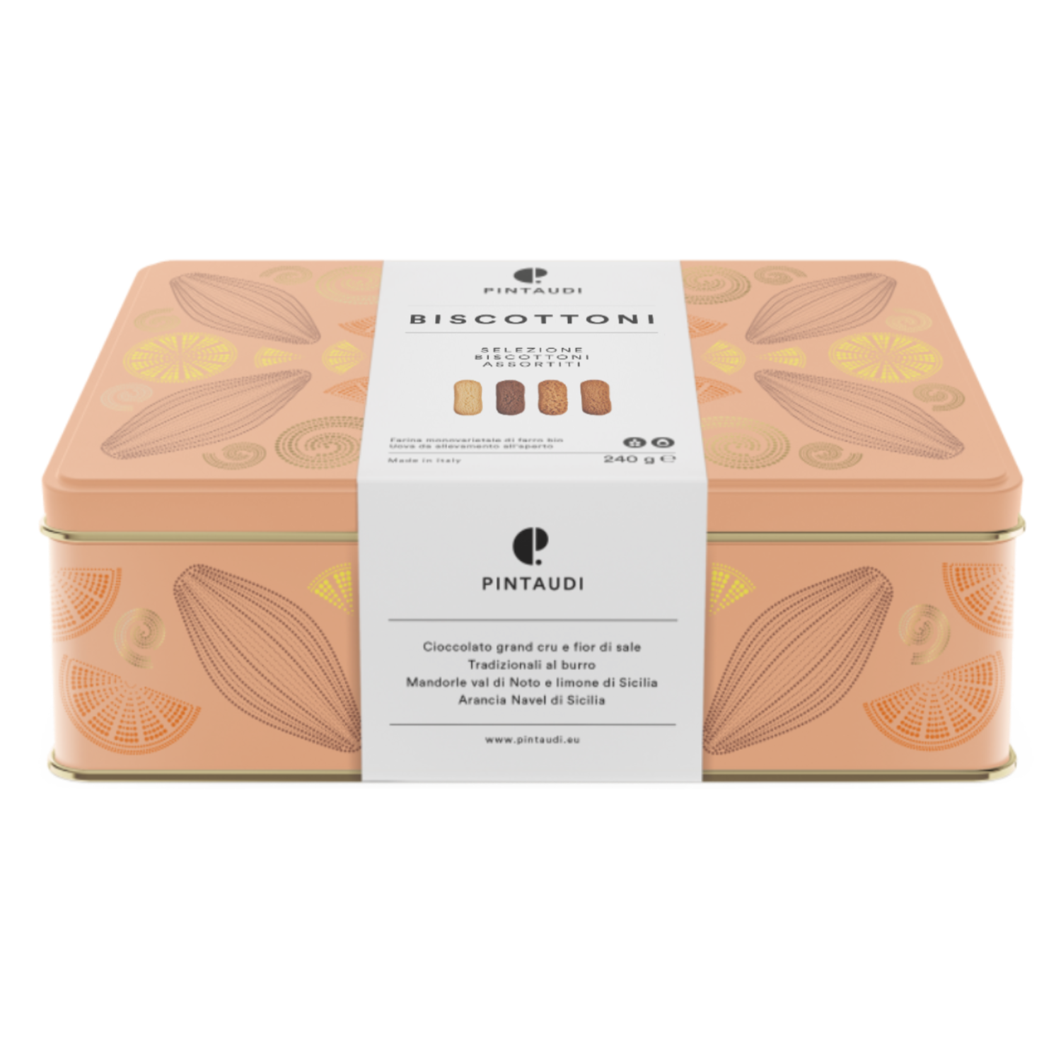 • “Biscotti Tradizionali Assortiti”: scatola in metallo con all’interno vassoio confezionato con biscotti italiani ricetta tradizionale al burro ai sapori: nocciole Piemonte, burro solo, farro e miele, grano integrale (1 x 240 grammi). Prodotto in Italia.