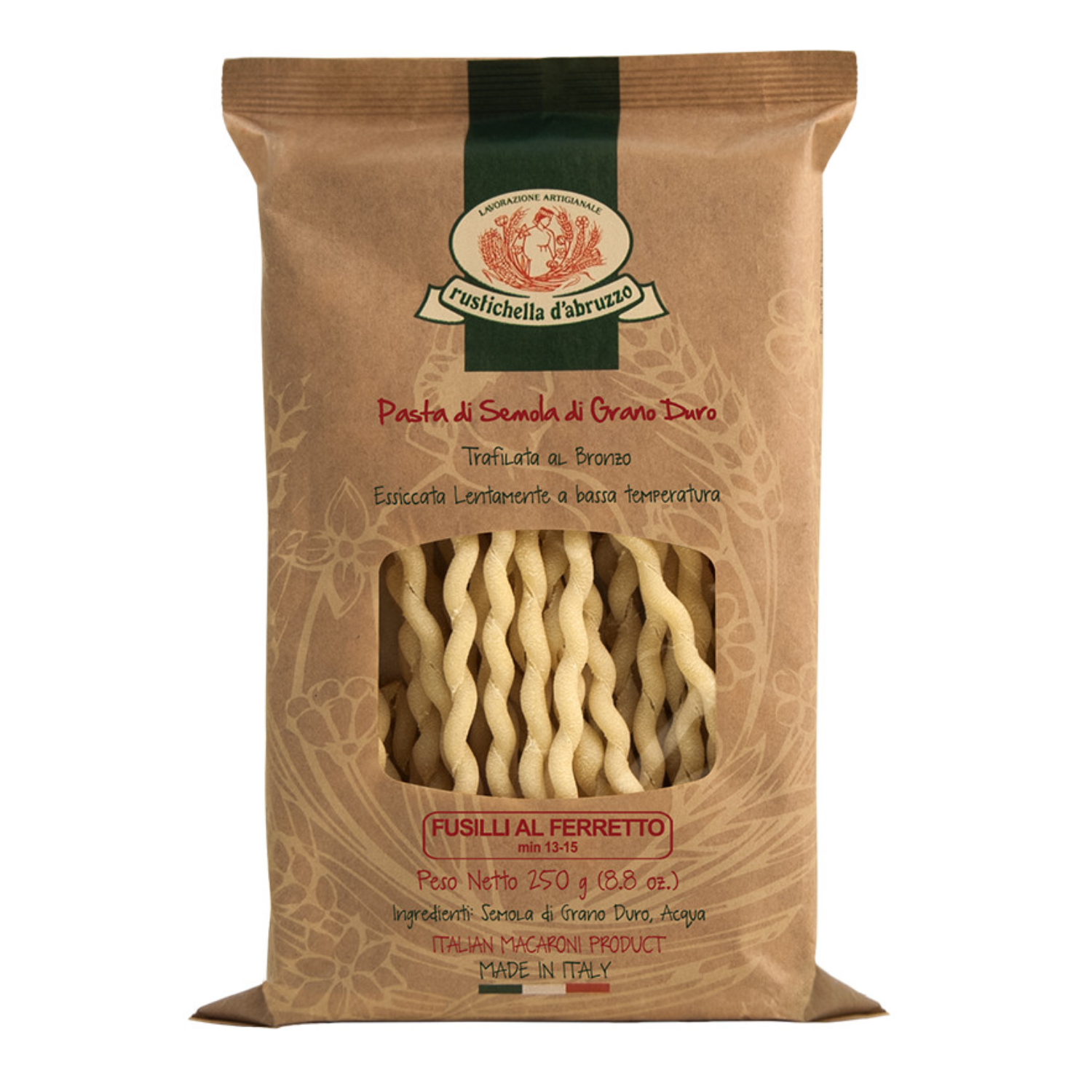 - “Fusilli al Ferretto”: pasta lunga fusilli al ferretto, pasta di semola di grano duro trafilata al bronzo essiccata lentamente a bassa temperatura (1 x 250 grammi). Prodotto in Italia.