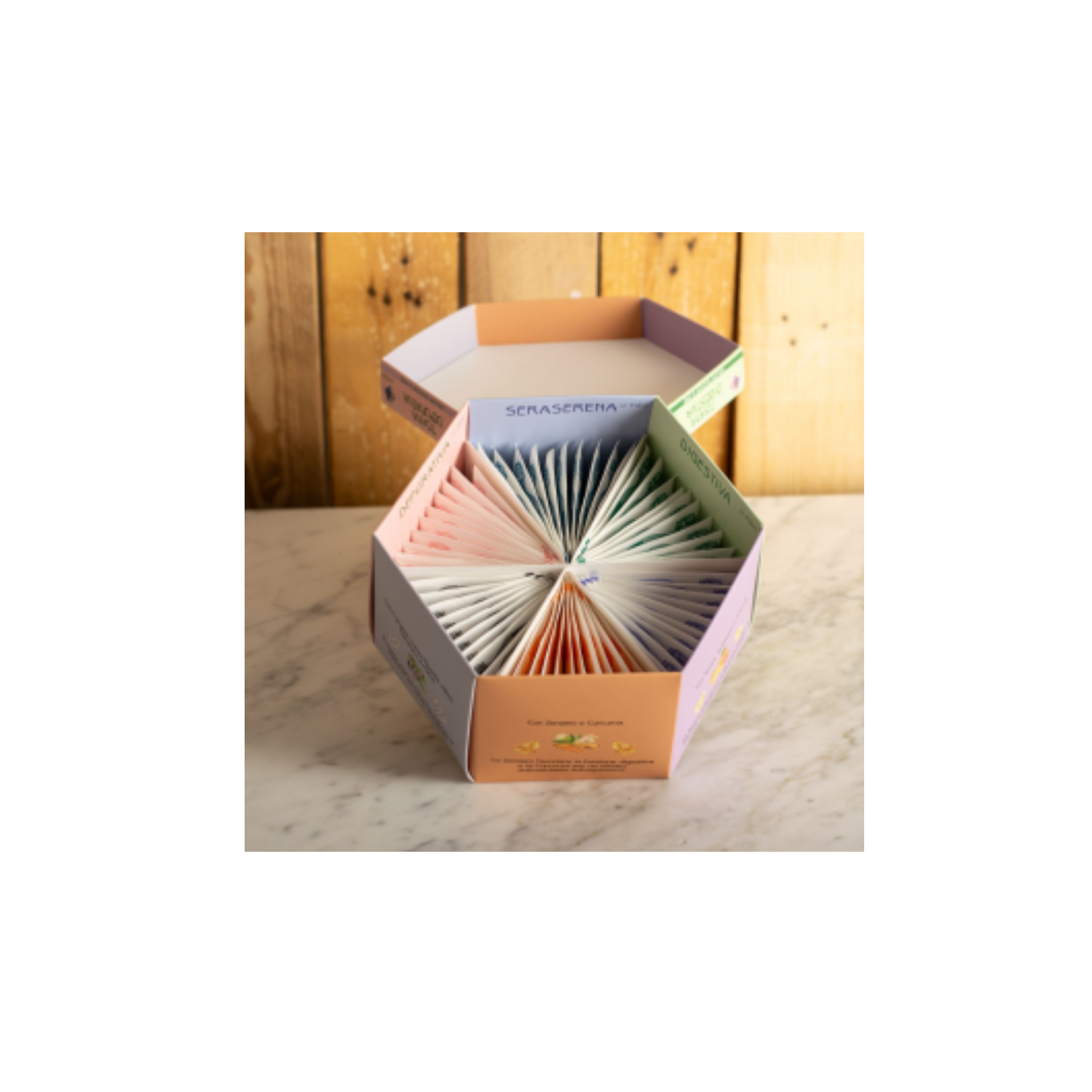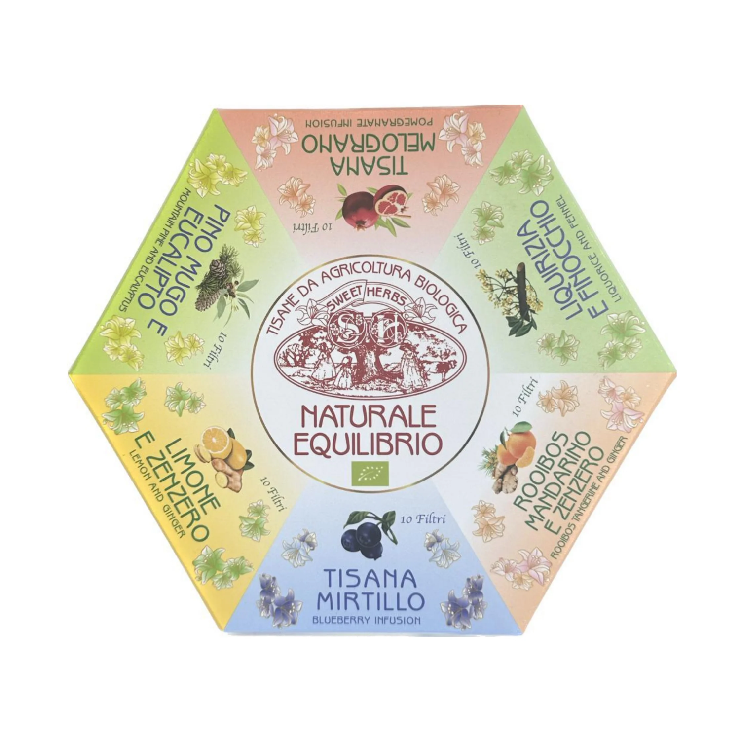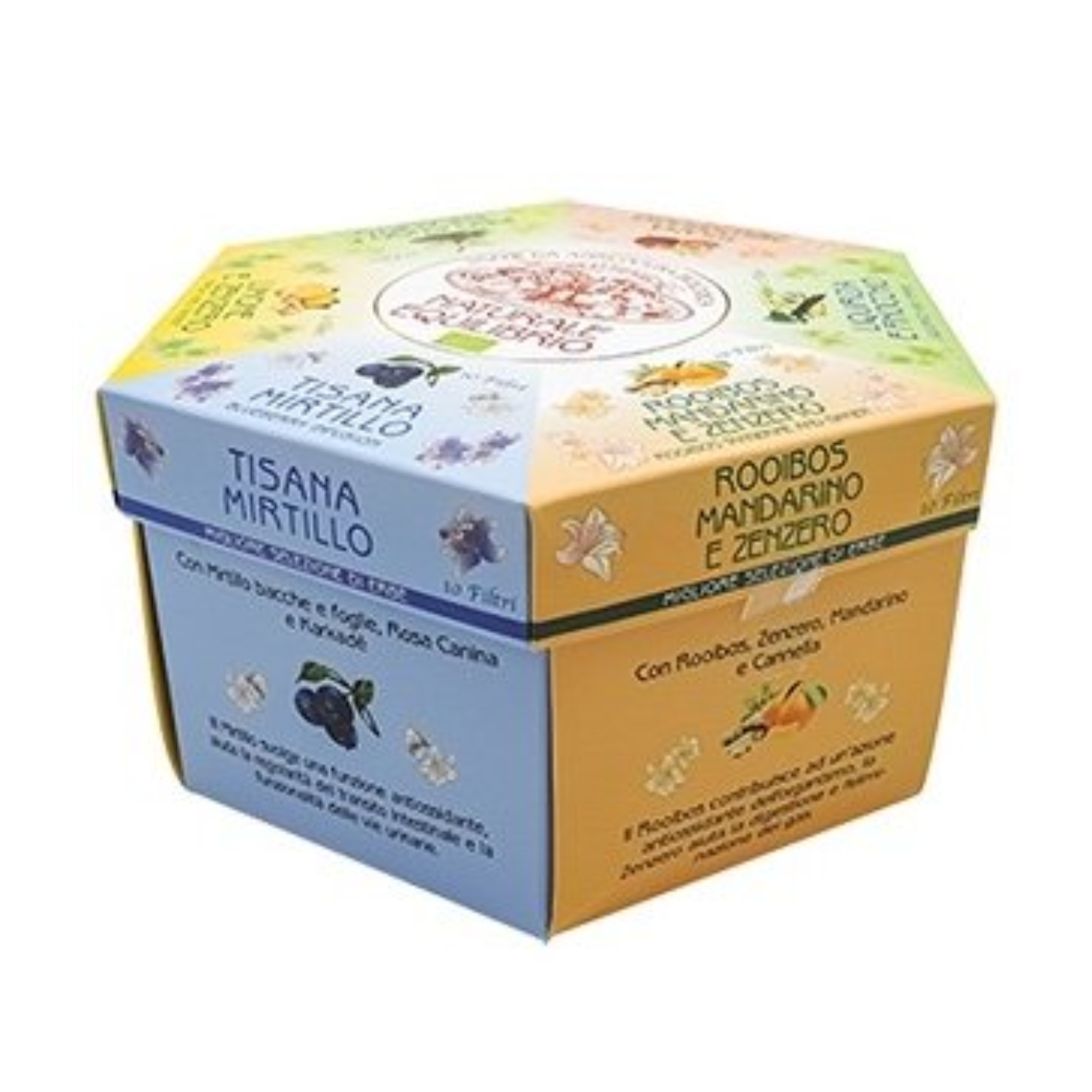 - “Naturale Equilibrio”: cofanetto regalo con all’interno 60 filtri di tisane biologiche assortite in 6 sapori differenti: tisana mirtillo, tisana limone zenzero, tisana pino mugo eucalipto, tisana melograno, tisana liquirizia finocchio, tisana rooibos mandarino zenzero (60 bustine – 85 grammi). Prodotto in Italia.